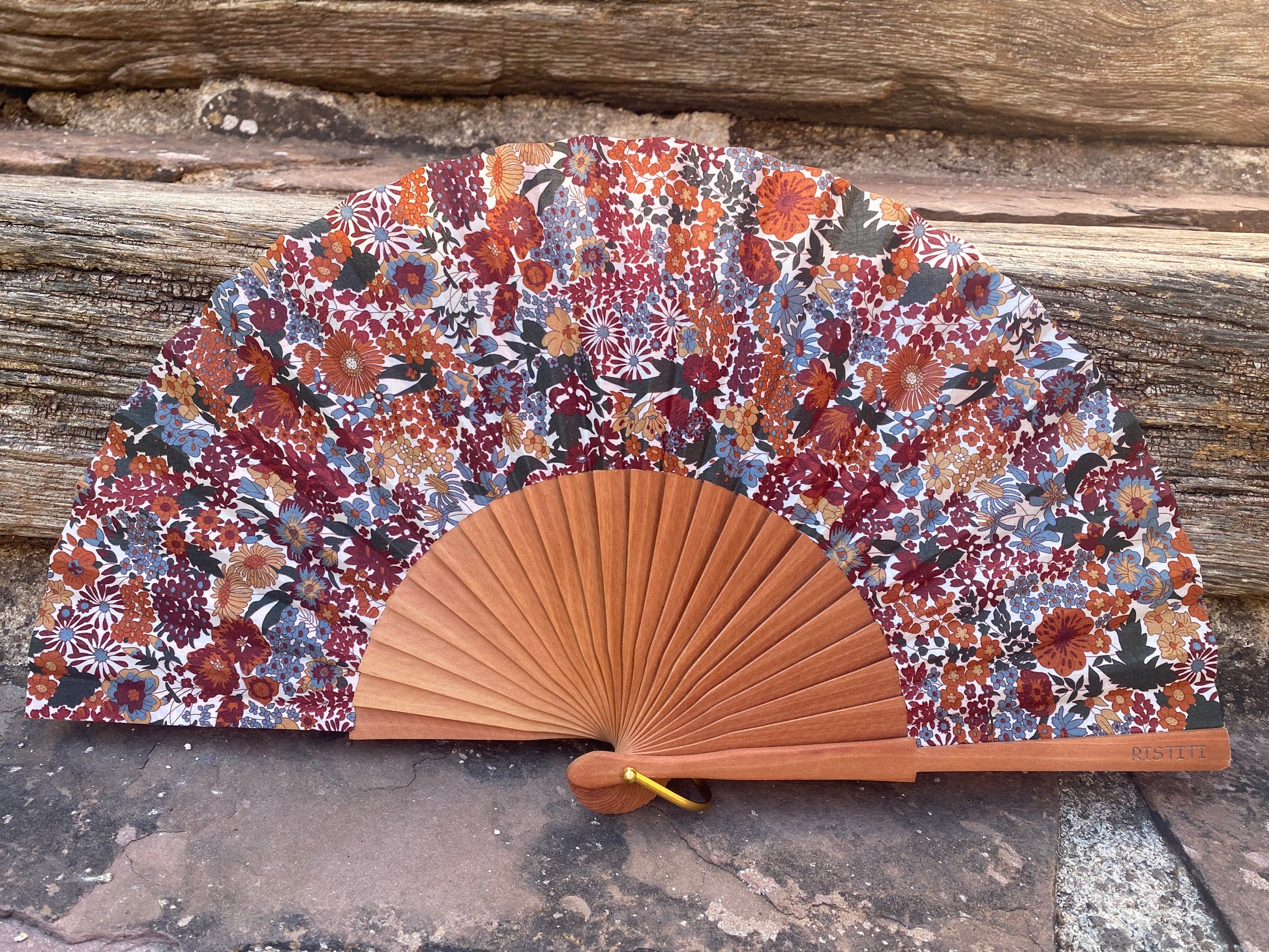Abanico de fabricación artesanal, hecho en España. La tela como siempre Liberty original. La madera utilizada es de peral. El tamaño del abanico es de 19cm. Tamaño ideal para guardar en el bolso. Además he añadido una anilla en el ojo del abanico, muy funcional para así poder colgarlo de nuestros llaveros largos multiusos que podéis encontrar también en mi web, con la tela a juego.
