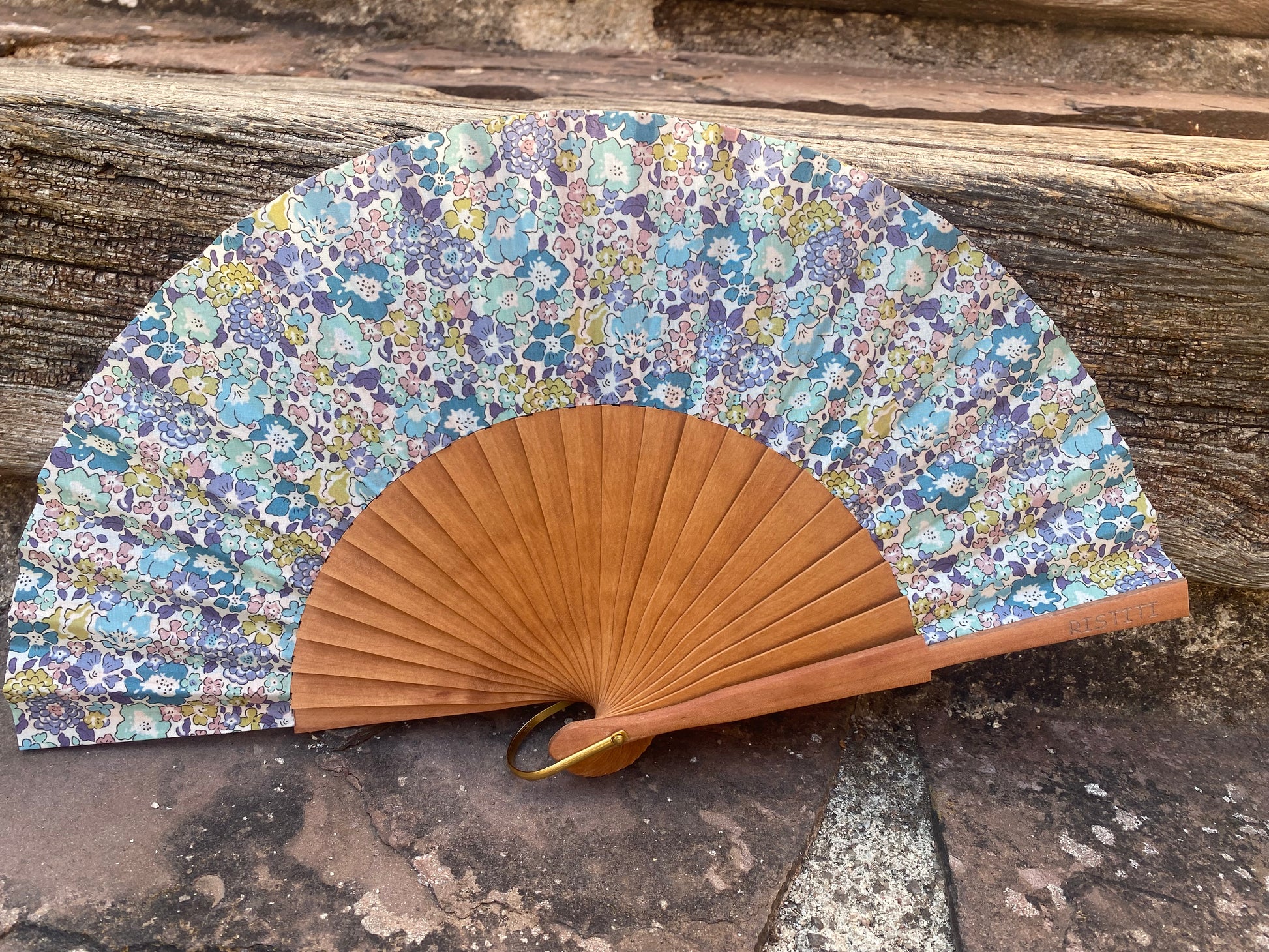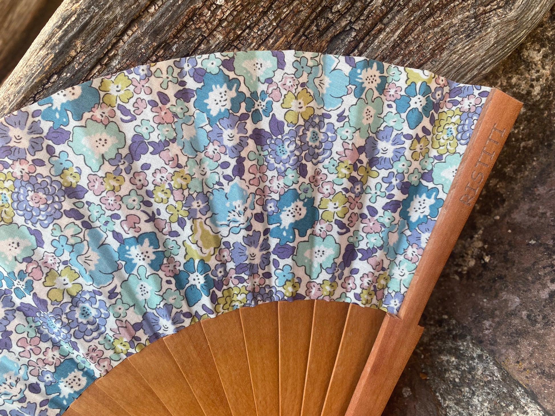 Abanico de fabricación artesanal, hecho en España. La tela como siempre Liberty original. La madera utilizada es de peral. El tamaño del abanico es de 19cm. Tamaño ideal para guardar en el bolso. Además he añadido una anilla en el ojo del abanico, muy funcional para así poder colgarlo de nuestros llaveros largos multiusos que podéis encontrar también en mi web, con la tela a juego.