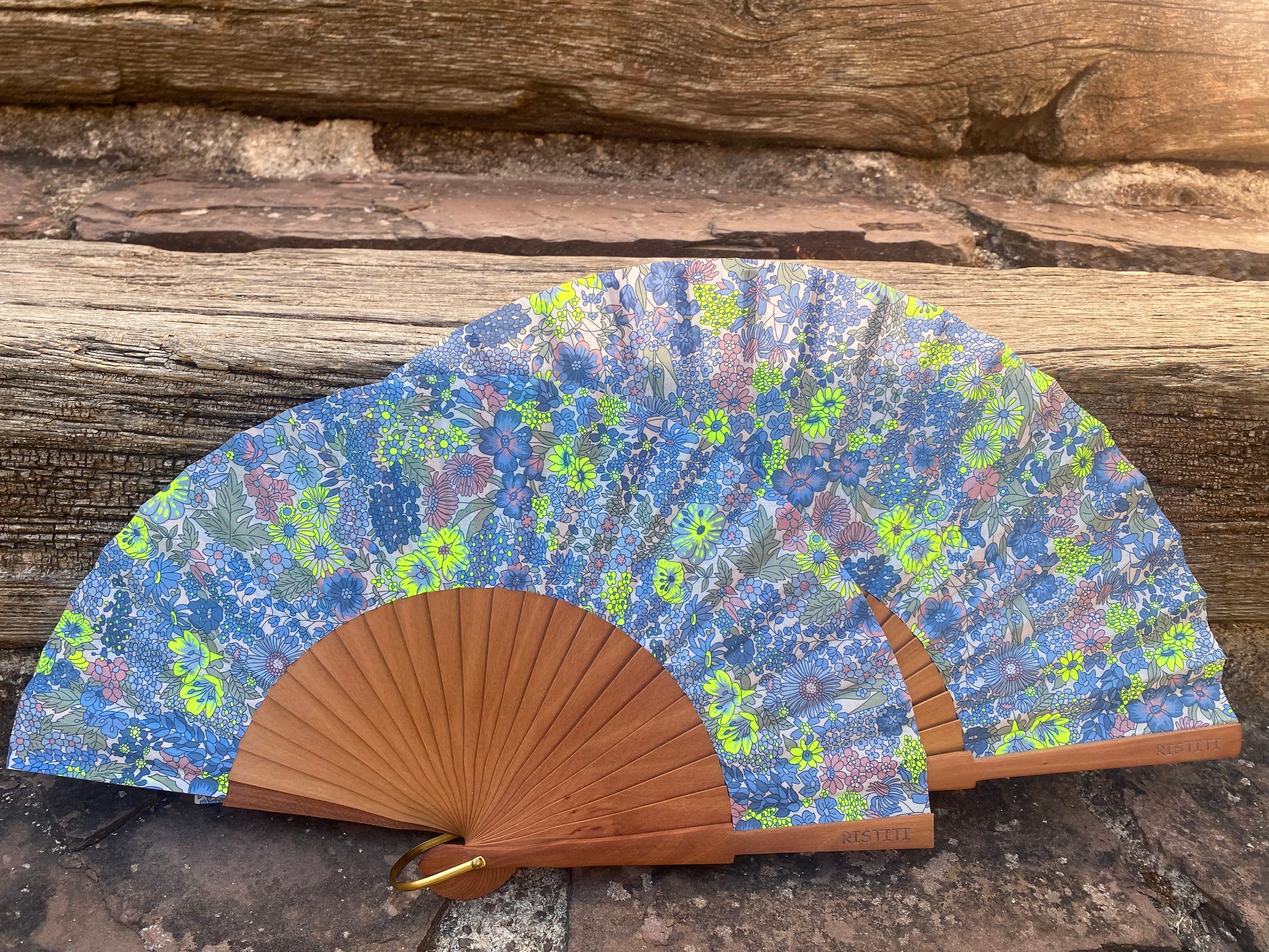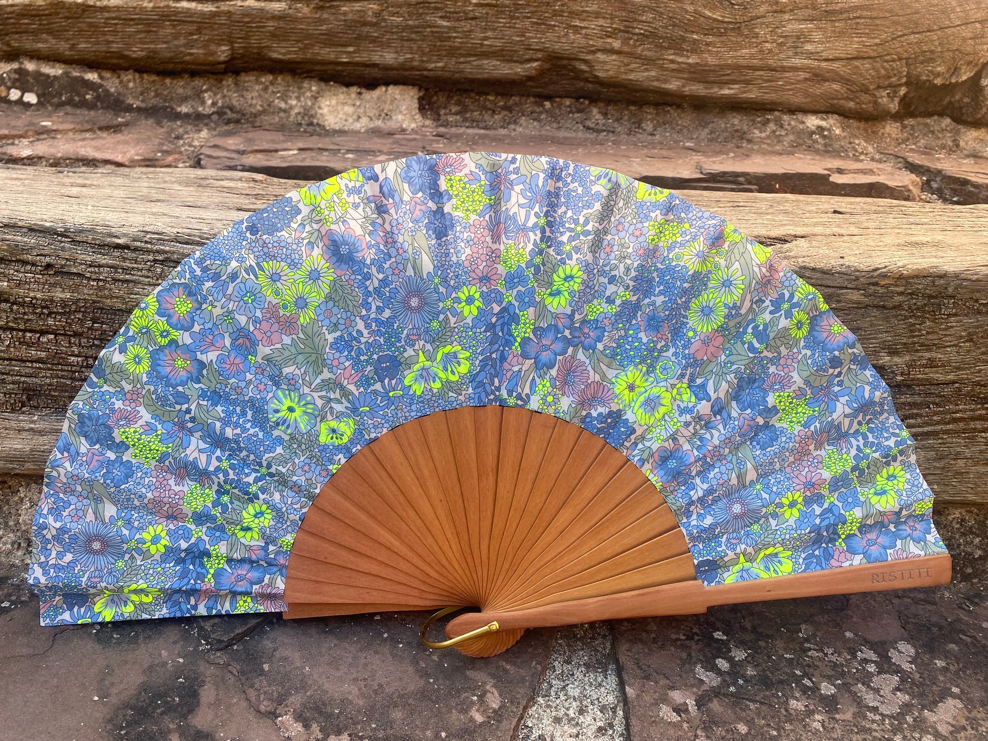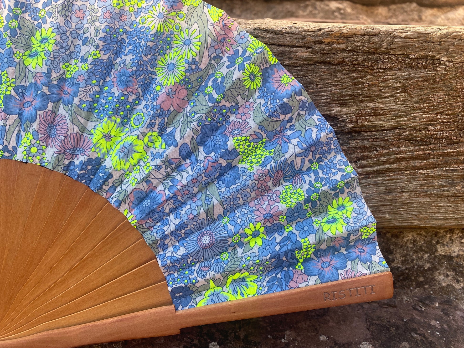 Abanico de fabricación artesanal, hecho en España. La tela como siempre Liberty original. La madera utilizada es de peral. El tamaño del abanico es de 23 cm. Tamaño ideal para guardar en el bolso. Además he añadido una anilla en el ojo del abanico, muy funcional para así poder colgarlo de nuestros llaveros largos multiusos que podéis encontrar también en mi web, con la tela a juego.